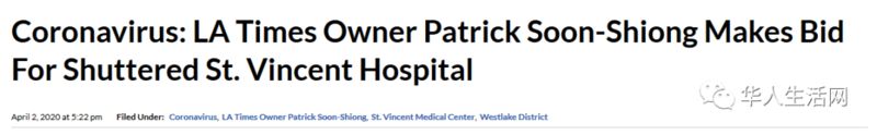 黄馨祥和妻子米歇尔·B·陈(Michele B. Chan)建立的“陈-馨祥家庭基金会”(Chan Soon-Shiong Family Foundation)已提出以1.35亿美元的价格收购圣文森特医疗中心,使其摆脱破产状态。
