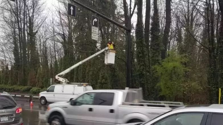 这位警察叔叔穿上反光的小马甲,爬上路旁的升降机假装成道路施工人员。