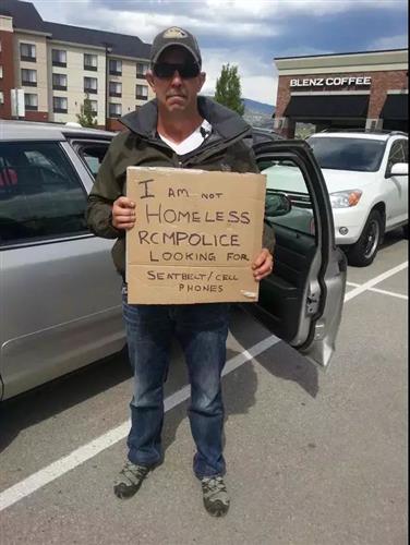看似是流浪汉在乞讨,实际上牌子上写的是:“我不是流浪汉,我是一个加拿大骑警,看看谁不系安全带或是开车打电话”。