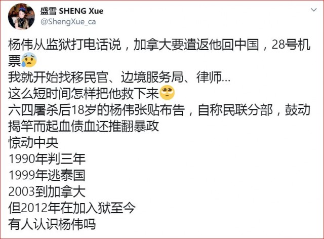 据当初安置杨伟在自家居住一段时间的民运人士盛雪推特介绍,杨伟大概因语言障碍和误会在多伦多搭乘公交车与司机发生争执,情急之下拿出一把小刀挥舞了几下,因此被判入狱9年,涉及刑事犯罪,永久居民身份被取消。但他是中国前政治犯,是被保护人士,我认为加拿大不可以把他遣返回国,我已经为他雇请律师着手阻止。