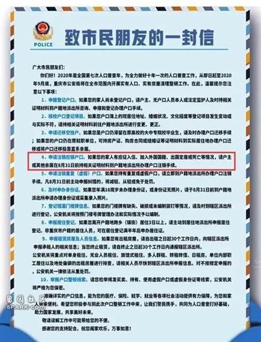 直至今年7月份,中国正式宣布消息称:2020年11月1日起,政府将在全国范围内展开第七次人口普查,凡是征兵入伍、死亡人员、加入外国国籍和出国(境)定居者,按规定应注销户口而未注销的,户主或其亲属当在2020年8月20日前持相关证明材料到户籍地公安派出所办理户籍注销手续。