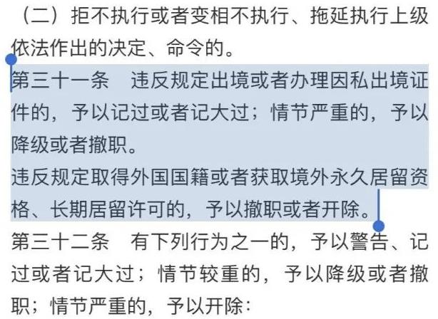 与此同时,中国还宣布了另一则重磅消息:即从2020年7月1日起,违反规定取得外国国籍或永居证的公职人员,予以撤职或开除处理。