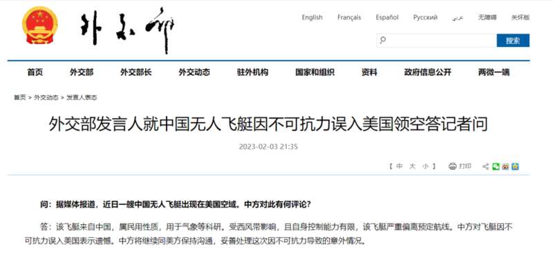 2月3日,美国媒体密集报道,中国的一个高空气球正在美国上空飘荡,按照它的飞行路径预测,这个气球有可能从空中横跨美国。北京时间的当天下午,中国外交部也在记者会上回应并确认,这个高空飞艇是中国相关单位的科研气象飞艇,因受到不可抗拒之力影响误入美国,对此表示遗憾。