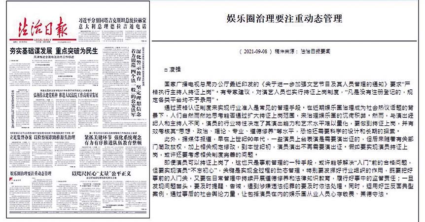 除了吴亦凡犯案被捕,内地艺人霍尊及张哲瀚也涉事遭当局严惩,郑爽与赵薇也涉因逃税被封杀。有见艺人屡现劣迹,国家广播电视总局办公厅早前印发《关于进一步加强文艺节目及其人员管理的通知》,要求“严格执行主持人持证上岗”制度,日前有专家在内地《法治日报》撰文,建议对演艺人实行持证上岗制度,指明“凡是没有注册登记的,规定各类平台均不予录用。”