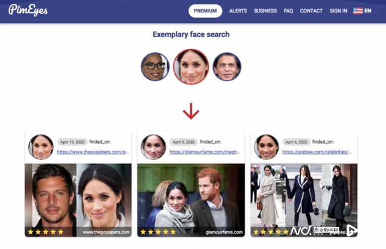 2020年6月,PimEyes官网以哈里王子夫人梅根为例展示搜索结果。图自Netzpolitik