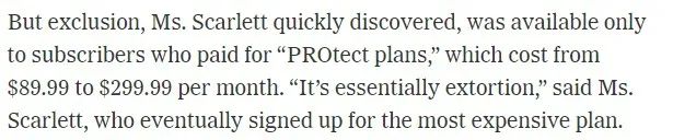 由于担心人们会对这些图片做出什么反应,Scarlett 立即开始研究如何将它们移除。当她在 PimEyes 上点击其中一张照片时,会弹出一个菜单,提供指向该图像的链接、以及 PimEyes 上“从公共搜索结果中排除”的选项。但是,她很快发现,只有为“保护计划”付费的订阅者才能获得排除,该计划的费用从每月 89.99 美元到 299.99 美元不等。“这本质上是敲诈勒索,”Scarlett 说,但为了移除这些照片,她还是选了最贵的一个套餐付了钱。