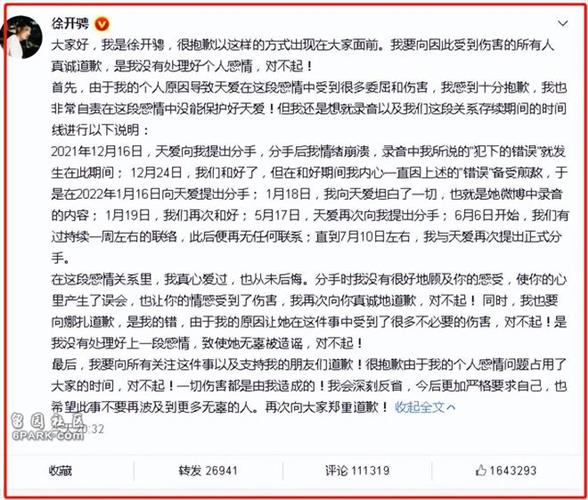 8月25日,张天爱、娜扎和徐开骋的“三角恋”上了热搜之后,眼看事情再也压不住,徐开骋终于发文道歉。长文中,徐开骋表示,他在2021年12月到现在,和张天爱之间发生了矛盾(确实和娜扎有关),两人曾先后四次提出分手,但每次都因为各种原因和好了。直至2022年7月10日,两人再次提出分手,至今也没有联络。