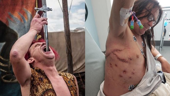 报道指,他当时嘴里吞了5把剑,每把宽约半英寸(1.27cm),长约24到28英寸(约60到70cm),虽然刀尖很钝,但他必须将5把剑紧紧相握,避免互相摇晃,但他受访时表示,自己当天太快就放开手,导致其中两把剑穿透食道,一把刺破了肝叶,另一把刺穿肺部。医生起初一度认为他救不活了,一名医护人员事后告诉他,大家都以为他会死在手术台上。幸好尼尔森经历多次手术,总算捡回一命,不过距离康复还有一段时间。