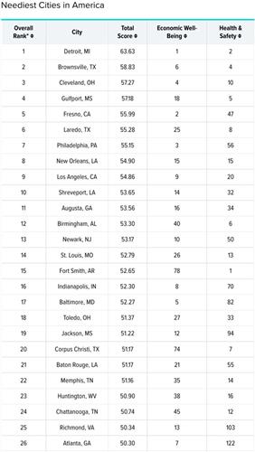 根据全美终结游民联盟(National Alliance to End Homelessness)数据,2020年1月,有超过58万人(其中许多是儿童)曾一度无家可归。继续处理通胀经济后果和新冠持续阴影的同时,重要的是既帮助现有贫困人口,又尽量减少新增贫困人口。个人理财网站WalletHub基于28项经济指标对全美182个城市进行排名,包括儿童贫困、食品匮乏和厨房不足等。底特律、克利夫兰、费城和洛杉矶竟然全部跻身全美10大“最短缺”城市。