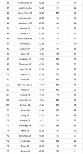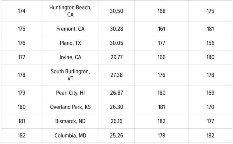 根据WalletHub的计算,全美最不贫困的城市是马里兰州哥伦比亚特区的郊区,繁华的Howard县。排名靠后的其他城市包括北达科他州首府Bismarck、堪萨斯城郊区的Overland Park、大檀香山的一部分Pearl City、Ben & Jerry's的故乡弗吉尼亚州South Burlington,以及加州Irvine。除“总分”外,表中所有栏目都描述城市的相对排名,排名为1代表该指标类别最差条件↓