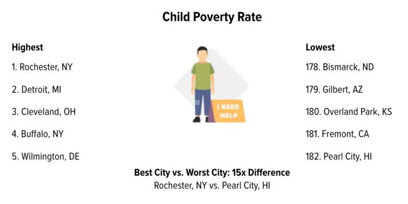 WalletHub的分析单独列出了特定需求衡量标准上比率较高的城市。儿童贫困率最高的是纽约州Rochester,其次是底特律和克利夫兰。