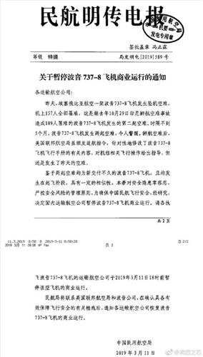 鉴于两起空难均为新交付不久的波音737-8飞机,且均发生在起飞阶段,具有一定的相似性,本着对安全隐患零容忍、严控安全风险的管理原则,为确保中国民航飞行安全,3月11日9时,民航局发出通知,要求国内运输航空公司于2019年3月11日18时前暂停波音737-8飞机的商业运行。