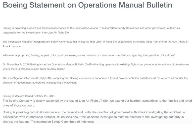 客机确定自身是否失速的一个重要判断标准是失速临界迎角(angle of attack),它是确定机翼在气流中姿态的基准。而波音公司发布的公告称,当飞行员使用手动驾驶时,因为迎角传感器错误的输出数据,可能会使水平稳定器向下倾斜飞机机头,使飞机变得难以控制。11月6日,波音公司发布了一份操作手册公告(OMB),指导操作员遵守现有的机组人员程序,以解决AOA传感器输入错误的情况。