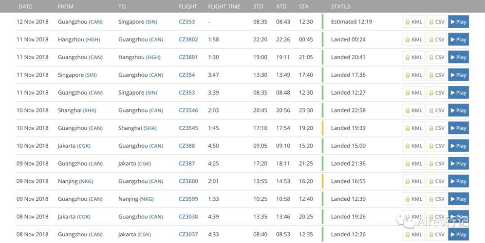 点击该飞机的「Recent Flights」链接即可查看它的历史飞行记录。在过去的五天,我们可以看到它以广州为基地,飞过雅加达、南京、上海、新加坡和杭州等多个城市,上面还显示了航班号、飞行时间、实际起降时间等信息。