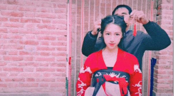 笨拙地给女儿编头发,戴发簪;