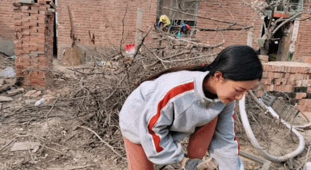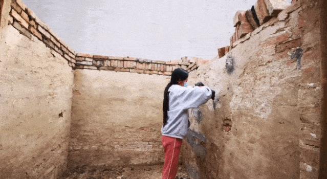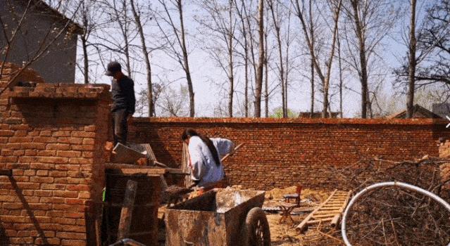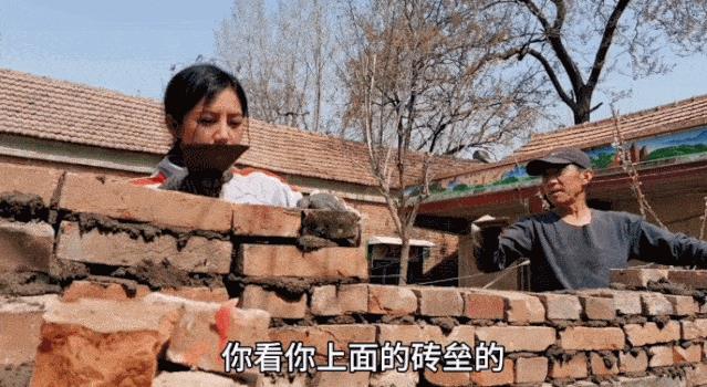 有一回,家里的院墙塌了,父女俩一起翻修,小登变身砌墙小能手。
