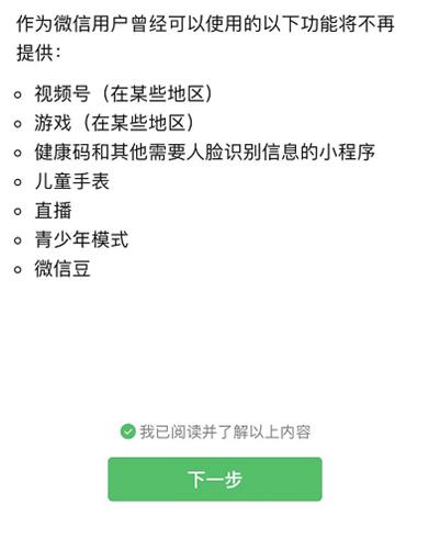 停用的功能包括:视频号(某些地区)、游戏(某些地区)、健康码和其他需要人脸识别信息的小程序、儿童手表、直播、青少年模式、微信豆。