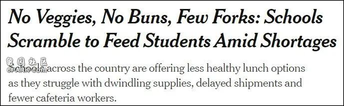 美国人,突然吃饭难了。首先,吃不饱的,是学生。据美国《纽约时报》9月27日报道,美国全国各地学校正面临鸡肉、面包等食堂主食和塑料餐具的短缺。美国学生正遭遇30年未遇的“吃饭难”问题。