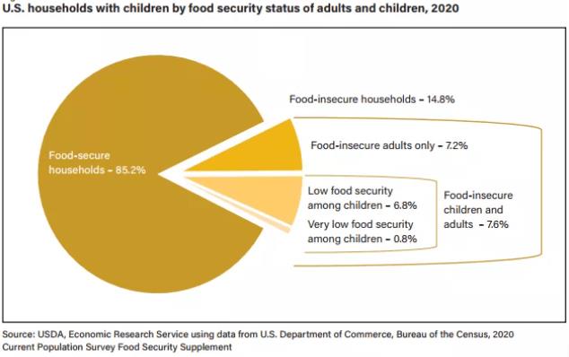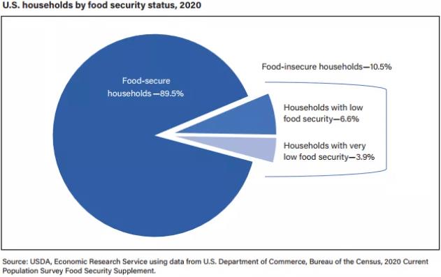 其实,一部分美国人去年就开始吃不饱饭了。据美国农业部公布的2020年美国家庭食物安全报告显示:2020年,89.5%的美国家庭能保证粮食安全,剩下的10.5%则面临着粮食不充足的威胁,3.9%的美国家庭面临较低的粮食安全水平。