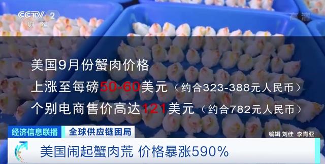 美国9月蟹肉价格上涨至每磅50-60美元,个别电商售价甚至高达121美元,暴涨约590%。