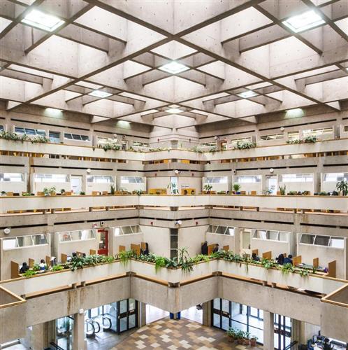 粗野主义可能不是每个人的一杯茶,但Scott图书馆是一座建筑的绝佳时间胶囊,其始于 1971 年的室内设计风格,则介乎Robarts 和多伦多参考图书馆之间。在外面,一个色彩缤纷的雕塑和倒影池,为图书馆的混凝土外观和倒置的露台增添了有趣的色彩。