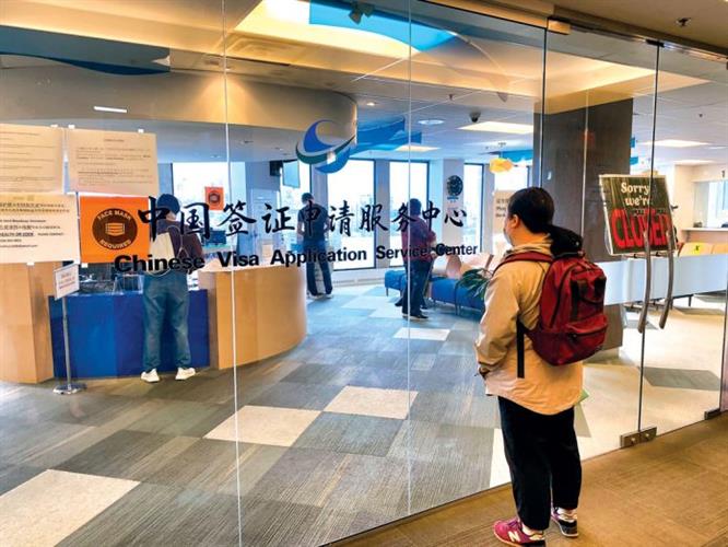 记者周一来到位于西百老汇街999号(W. Broadway)的中国签证中心,发现原本开放的玻璃大门紧闭,且置有“关闭”的牌子,而位于走廊右侧的门口则成为申请者出入口,门外摆放著“非请勿进”的牌子,以及要求戴口罩及洁手的要求。