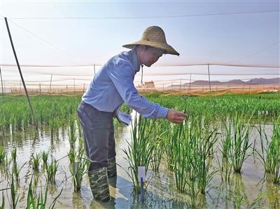 农科院的科研人员在观察水稻。