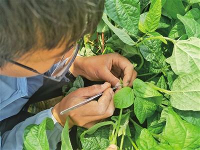 正午时分,洪慧龙和他的同事、老师们安静地坐在大豆地里,一个个寻找正在开放的花,用镊子给它们授粉,每做完一个,就写一个标签挂上。