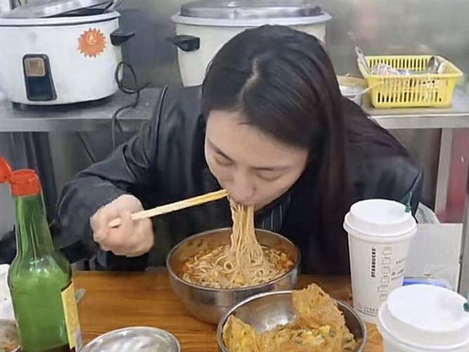 马苏的身后摆放着电饭煲、碗筷等,因此座位特别狭窄,但她毫不在意,化身“干饭人”,专心致志地品尝眼前的鱼粉。