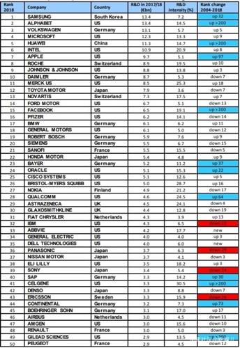 三星电子位列榜首,其共投入134.37亿欧元研发经费,占营业额比重为7.2%;谷歌母公司Alphabet以133.88亿欧元研发投资额排名第二,紧随其后的分别是德国大众(131.35亿欧元)、美国微软(122.79亿欧元)和中国华为(专题)(113.34亿欧元)。