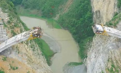 这座拱桥几乎悬空而建,桥下峡谷幽深,建设画面令人胆战心惊。它就是位于川滇黔三省交界处的鸡鸣三省大桥。