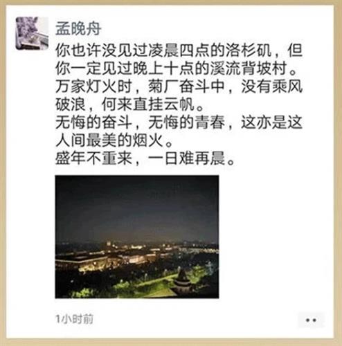 综合媒体7月23日报道,孟晚舟朋友圈7月22日晚发文:“你也许没见过凌晨四点的洛杉矶,但你一定见过晚上十点的溪流背坡村。万家灯火时,菊厂奋斗中,没有乘风破浪,何来直挂云帆。无悔的奋斗,无悔的青春,这亦是这人间最美的烟火。盛年不重来,一日难再晨。”配图是华为员工区溪流背坡村照片。