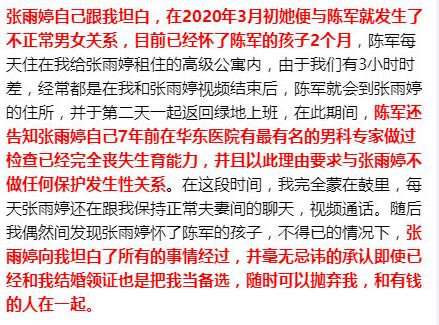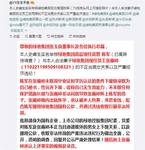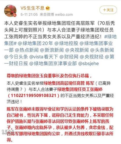 此前,微博用户“VS生生不息”(史睿生)在网上实名举报绿地京津冀事业部营销管理部总经理陈军和其合法妻子有不正当男女关系,并致其怀孕。