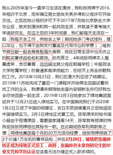 2020年2月3日绿地复工后,陈军特地将张雨婷安排成了自己的助理,以便两人有更多时间接触。此外,陈军用公司每个月20万的活动经费,为张雨婷报销过2个价值1万元的奢侈品包包。