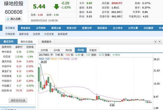 此事虽为高管个人行为,但以小见大,反观绿地控股近几年的表现,从市值大缩水、万亿巨额负债,到近年来重点布局的产业“大金融”涉嫌违规,似乎都昭示着这家地产巨头的颓势。5月20日开盘,绿地控股股价逐渐走低,收于5.44 元/股,较开盘价5.53元/股下滑1.63%。