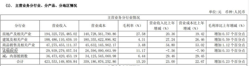从绿地的年报上,房地产和建筑是其收入的支柱。其中,房地产板块营业收入为1943亿,同比增长20.36%,毛利率为27.58%,建筑板块实现经营收入1885亿元,同比增长27%,毛利率只有4.31%。截至报告期末,在建项目总金额4349亿元,同比增长 33%。