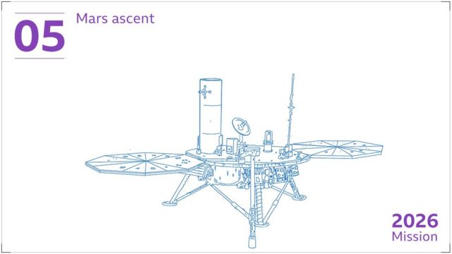 “取货车”把收集到的样本罐装到一个安全容器里,再把这个样本传输舱装到一个小火箭(MAV)上。这个火箭发射升空,把样本容器放到火星轨道上。