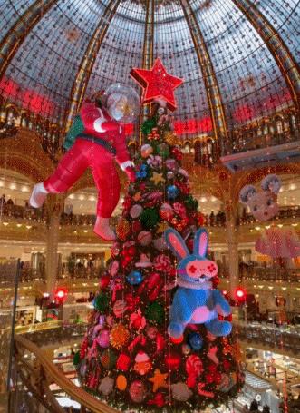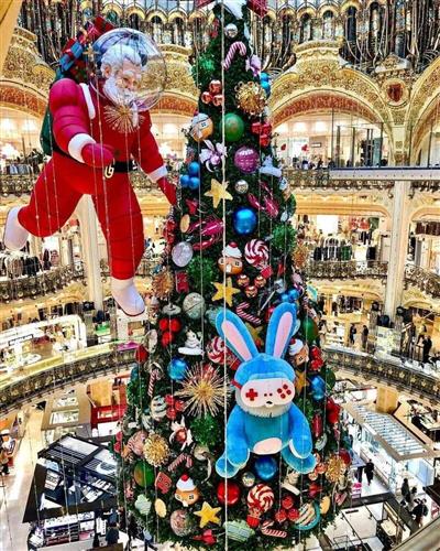 国家队代表已经这么给力了,商场也不遗余力。今年老佛爷百货的圣诞树充满童趣,一颗巨型圣诞树直通商场天花板,还有圣诞老人在空中飘浮,说起来,这个圣诞老人和老佛爷真人也有点像。