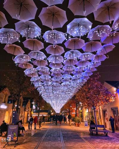 此外他还用白1200把白色发光雨伞,铺成200米长的雨伞步道,夜幕来临时,雨伞会闪闪发亮,成为不少情侣圣诞约会必去之地。