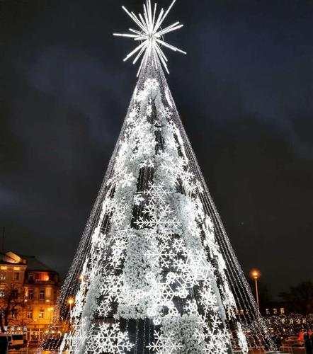 这座27米长的圆锥形装置上,覆盖着 96 片巨大的雪花、镜面冰和发光的光罩,顶部还有一颗直径6m的巨大恒星在闪闪发光。夜晚随着光影变化,把周围古老的城区都照亮,仿佛下一秒Elsa就会从后面蹦出来。