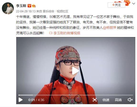 李玉刚随后在社交平台发文为之惋惜,写道:“我第一次看到坚强的她流下了眼泪,有无奈,有不舍,但我坚信,不管有没有舞台,她已经是一种纯粹和极致的象征,岁月从不败美人,杨丽萍的精神和灵魂可以永远起舞。”