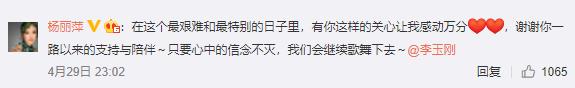 杨丽萍也在李玉刚的评论下表示:“在这个最艰难和最特别的日子里,有你这样的关心让我感动万分,谢谢你一路以来的支持与陪伴~只要心中的信念不灭,我们会继续歌舞下去~@李玉刚。”