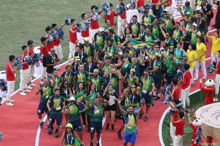 彩色大旗展开,是本届世警会开幕式主题:欢乐与荣耀。