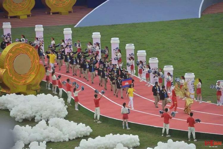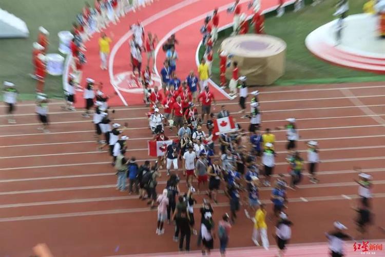 东道主中国队进场,无数观众起立致敬,庞大的中国参赛队员统一着装红色上衣和白色长裤。