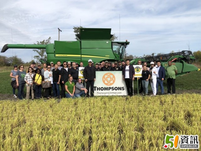在九月这个秋高气爽的日子,方正公司在本地农场主的帮助下,成功使用本地农机完成收割,亩产超过1000斤。虽然由于水分、机械设置的原因导致了一部分的收割损耗,公司董事长尹先生仍对今年的产量表示满意,这代表了水稻适合在安省西南部生长且产量喜人。