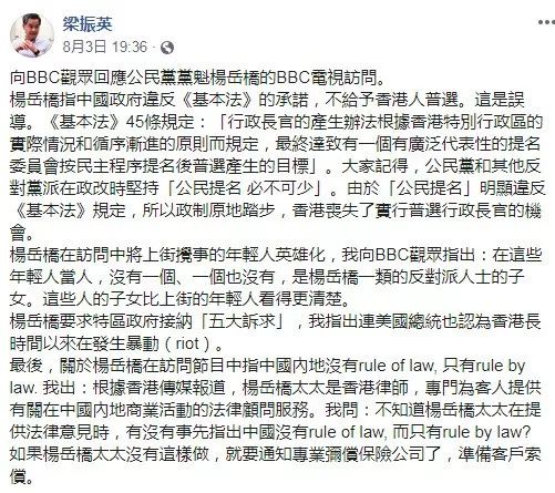 杨岳桥善辩更善变。2019年8月2日晚间,英国广播公司(BBC)网站发布了一段对杨岳桥的专访视频。他在接受采访中高谈阔论:香港民众需要“普选权”。