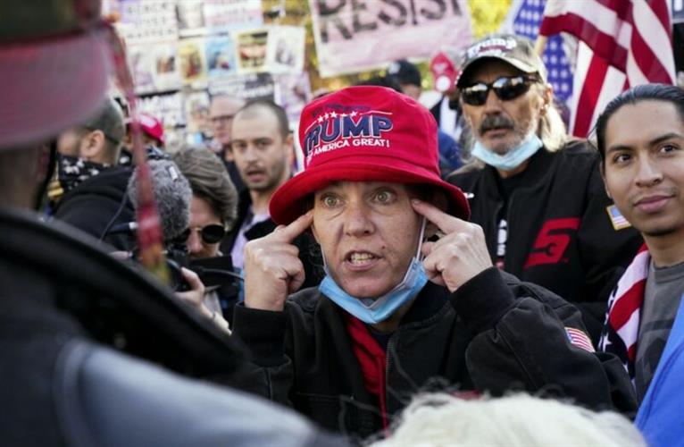 他们头戴MAGA的小红帽,挥舞着米字旗和“Trump 2020”的小蓝旗,高喊“MAGA”或“STOP THE STEAL”,认为是特朗普赢得了这一次大选,想要让他在白宫继续“再干四年”。