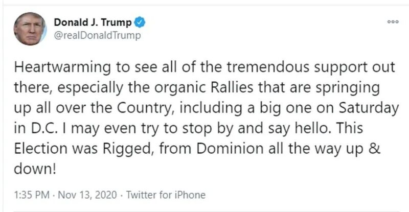 自从美国大选中不少摇摆州陆续翻蓝之后,特朗普就在一直上蹿下跳地叫嚣“选举欺诈!” 即便几乎所有媒体都已经“官宣”了拜登赢得大选,特朗普依旧死不服输,不仅在翻蓝的摇摆州发起多个诉讼,还在推特上号召共和党人们捍卫选举正义。
