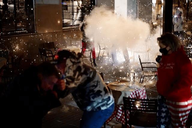 在其他街区,这种情况也屡见不鲜。一对落单的川粉小情侣,不仅被围在他们身边的“反抗议者”泼水,还险些被人拽到在地,幸亏有警察维护秩序,他们才得以安全离开。在没有警察维持秩序的地方,“反抗议者”掀翻了餐厅的桌子,朝着川粉扔烟花和瓶子,川粉则给他们回扔椅子。