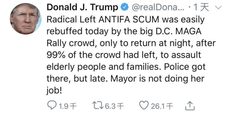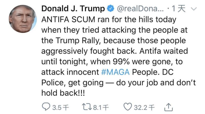 “ANTIFA人渣们今天试图在川普集会上攻击民众,只因为这些民众做出了有力的回击。ANTIFA一直等到99%的人都走了的晚上,才开始袭击无辜的MAGA民众。华盛顿特区警察,动起来——做好你的工作,不要退缩!!”